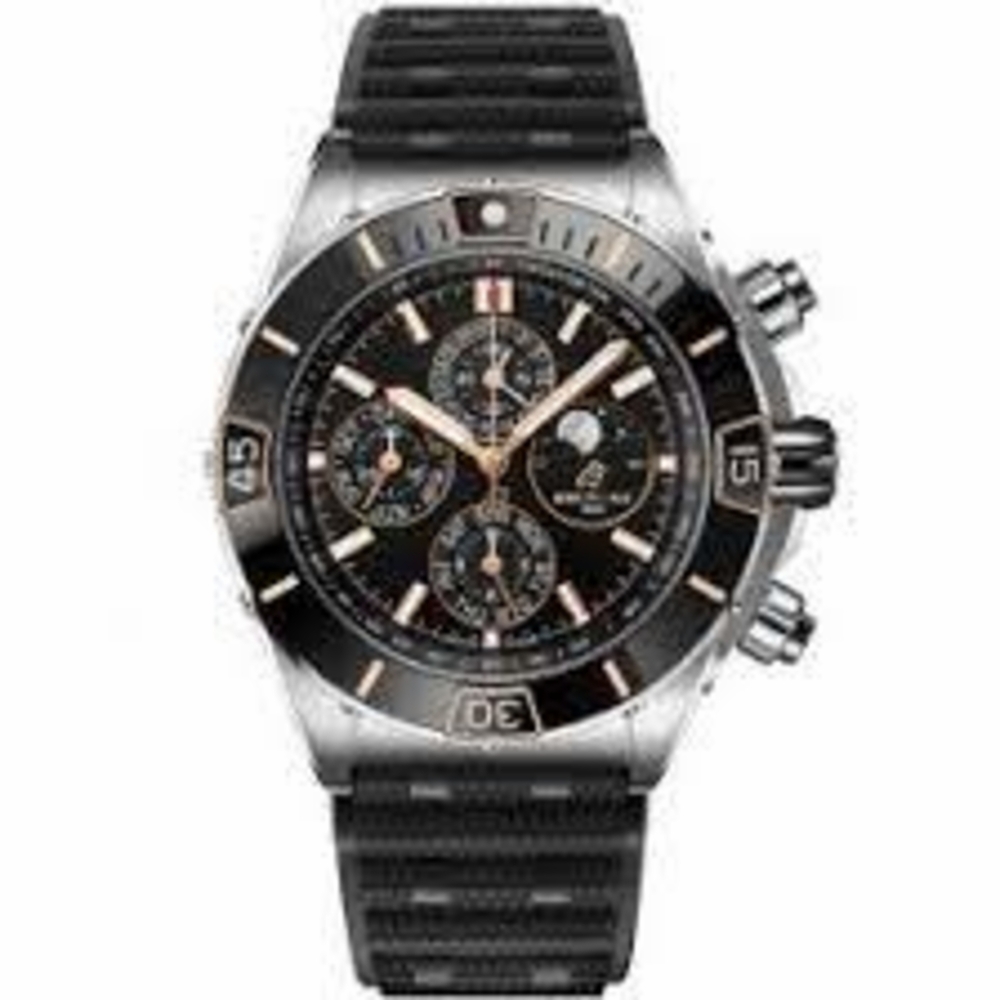 Silver-tone stainless steel case with a black rubber strap. Uni-directional rotating black stainless steel with an inlaid black ring bezel. Black dial with rose gold-tone hands and index hour markers. Minute markers. Tachymeter markings around the outer rim. Dial Type: Analog. Luminescent hands and markers. Four sub-dials displaying: 60 seconds / date, 30 minute / month and 12 hour / day of the week and moonphase. Automatic movement. Scratch resistant sapphire crystal. Screw down crown. Solid case back. Round case shape, case size: 44 mm, case thickness: 14.5 mm. Band width: 22 mm / 20 mm. Fold over clasp with a push button release. Water resistant at 100 meters / 330 feet. Functions: date, day, month, hour, minute, second, tachymeter. Additional Info: four year calendar. Chronomat 44 Series. Luxury watch style. Watch label: Swiss Made. Breitling Chronomat 44 Automatic Black Dial Mens Watch I19320251B1S1.