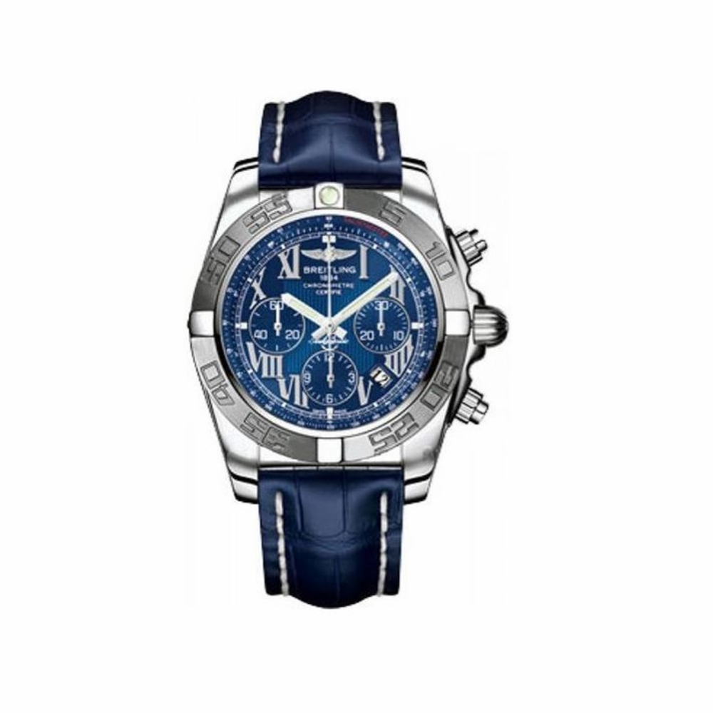 Silver-tone stainless steel case with a blue crocodile leather strap. Uni-directional rotating bezel. Blue dial with silver-tone hands and Roman numeral hour markers. Dial Type: Analog. Luminescent hands and markers. Date display between 4 and 5 o'clock position. Breitling Calibre B01 automatic movement with a 70-hour power reserve. Scratch resistant sapphire crystal. Screw down crown. Round case shape, case size: 44 mm, case thickness: 16.95 mm. Tang clasp. Water resistant at 500 meters / 1650 feet. Functions: chronograph, date, hour, minute, second. Chronomat 44 Series. Dive watch style. Watch label: Swiss Made. Breitling Chronomat 44 Chronograph Automatic Blue Dial Mens Watch AB011011/C783.731P.A20BA.1.