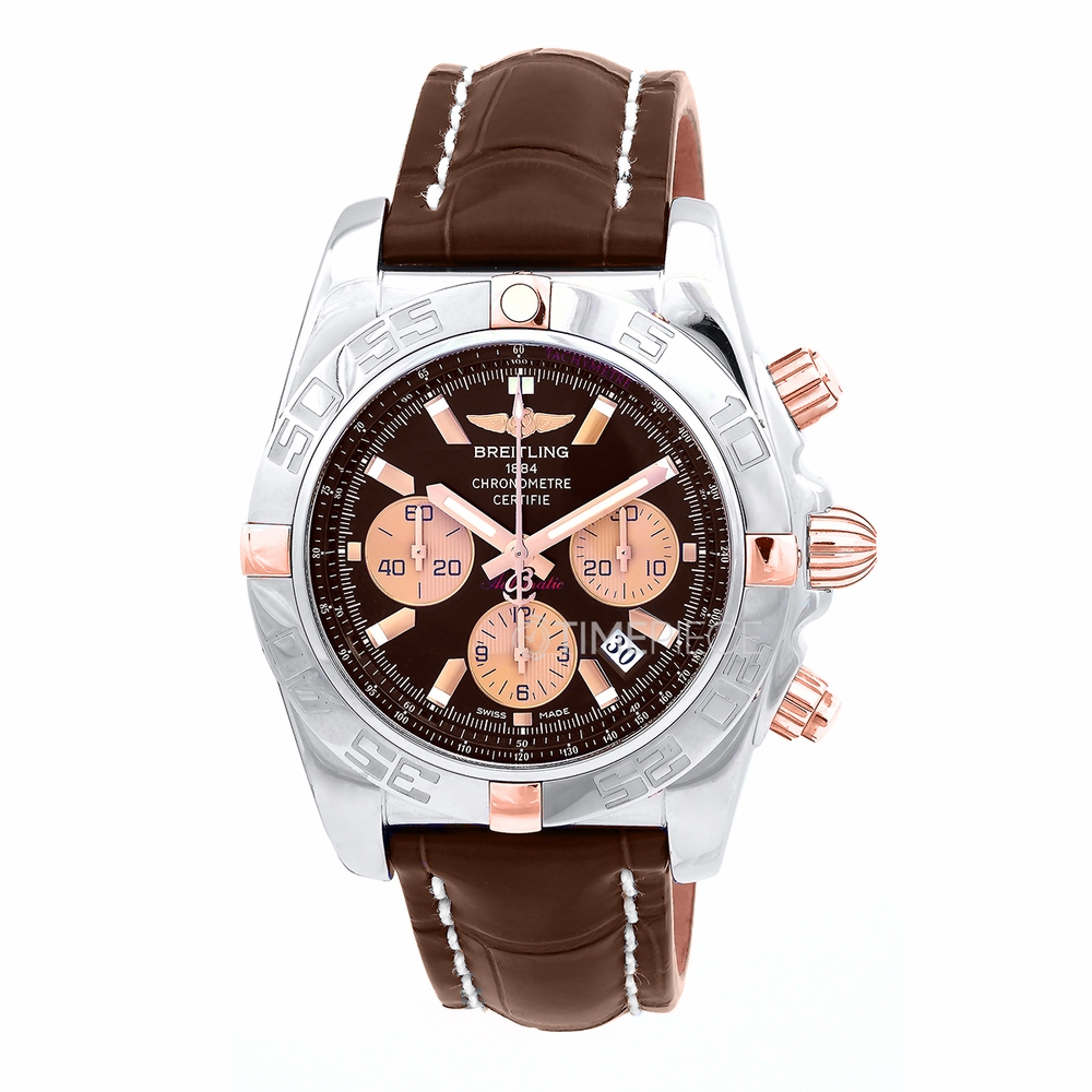 Polished 18k gold and stainless steel case with a brown alligator leather strap. Uni-directional rotating silver-tone stainless steel bezel. Brown dial with rose gold hands and index hour markers. Minute markers around the outer rim. Dial Type: Analog. Luminescent hands and markers. Date display between 4 and 5 o'clock position. Chronograph - three sub-dials displaying: 60 second, 30 minute and 12 hours. Automatic movement. Scratch resistant sapphire crystal. Screw down crown. Solid case back. Round case shape, case size: 43.5 mm. Band width: 22 mm. Tang clasp. Water resistant at 500 meters / 1650 feet. Functions: chronograph, date, hour, minute, second. Chronomat 44 Series. Dive watch style. Watch label: Swiss Made. Breitling Chronomat 44 Chronograph Automatic Brown Dial Mens Watch IB011012/Q576.740P.A20D.1.