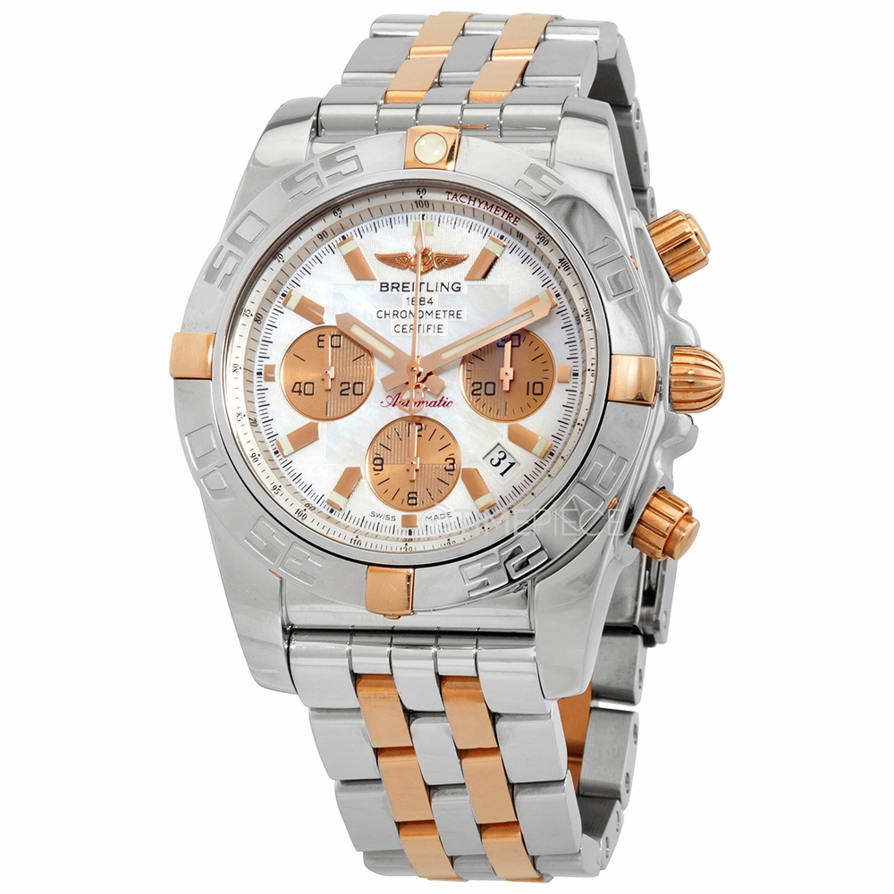 Stainless steel and 18kt rose gold case and bracelet. Uni-directional rotating bezel. Mother of pearl dial with rose gold hands and index hour markers. Dial Type: Analog. Luminescent hands and markers. Date display between 4 and 5 o'clock position. Chronograph - three sub-dials displaying: 60 second, 30 minute and 1/10th of a second. Breitling Calibre B01 automatic movement with a 70-hour power reserve. Scratch resistant sapphire crystal. Screw down crown. Solid case back. Round case shape, case size: 44 mm. Deployment clasp. Water resistant at 500 meters / 1650 feet. Functions: chronograph, date, hour, minute, second. Chronomat 44 Series. Dive watch style. Watch label: Swiss Made. Breitling Chronomat 44 Chronograph Automatic Mens Two Tone Watch IB011012/A697.375C.