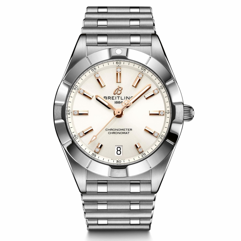 Stainless steel case with a stainless steel bracelet. Uni-directional rotating stainless steel bezel. White dial with luminous rose gold-tone hands and diamond-tipped index hour markers. Arabic numeral minute markers (at 5 minute intervals). Minute markers around the outer rim. Dial Type: Analog. Luminescent hands and markers. Date display at the 6 o'clock position. Breitling calibre 10 automatic movement, based upon ETA 2892-A2, containing 21 Jewels, bitting at 28800 vph, and has a power reserve of approximately 42 hours. Scratch resistant sapphire crystal. Pull / push crown. Solid case back. Round case shape. Case size: 36 mm. Case thickness: 10.1 mm. Band width: 18 mm / 16 mm. Fold over clasp with a push button release. Water resistant at 100 meters / 330 feet. Functions: date, hour, minute, second. Chronomat Series. Luxury watch style. Watch label: Swiss Made. Breitling Chronomat Automatic White Dial Ladies Watch a10380101a2a1.
