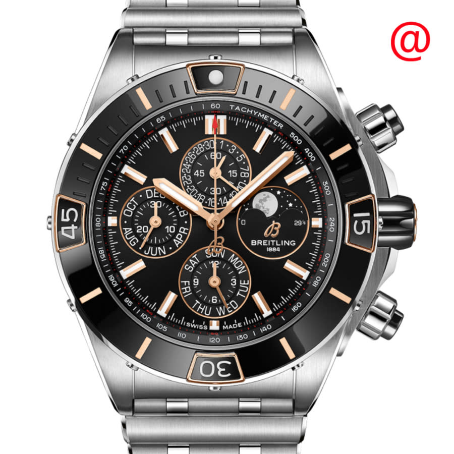 Silver-tone stainless steel case and bracelet. Uni-directional rotating black stainless steel bezel. Black dial with rose gold-tone hands and index hour markers. Minute markers around the outer rim. Dial Type: Analog. Luminescent hands and markers. Four sub-dials displaying: 60 second/date, 30 minute/month, 12 hour/day of the week and moonphase. Breitling Calibre 19 Automatic movement, based upon ETA 2892-A2, containing 38 Jewels, bitting at 28800 vph, and has a power reserve of approximately 42 hours. Scratch resistant sapphire crystal. Screw down crown. Solid case back. Round case shape, case size: 44 mm. Fold over clasp. Water resistant at 100 meters / 330 feet. Functions: perpetual calendar, leap year, moon phase, chronograph, month, date, day, hour, minute, small second, chronometer. Additional Info: original box, international warranty card, manual (complete accessories). Chronomat Series. Luxury watch style. Watch label: Swiss Made. Breitling Chronomat Perpetual Chronograph Automatic Chronometer Black Dial Mens Watch I19320251B1A1.