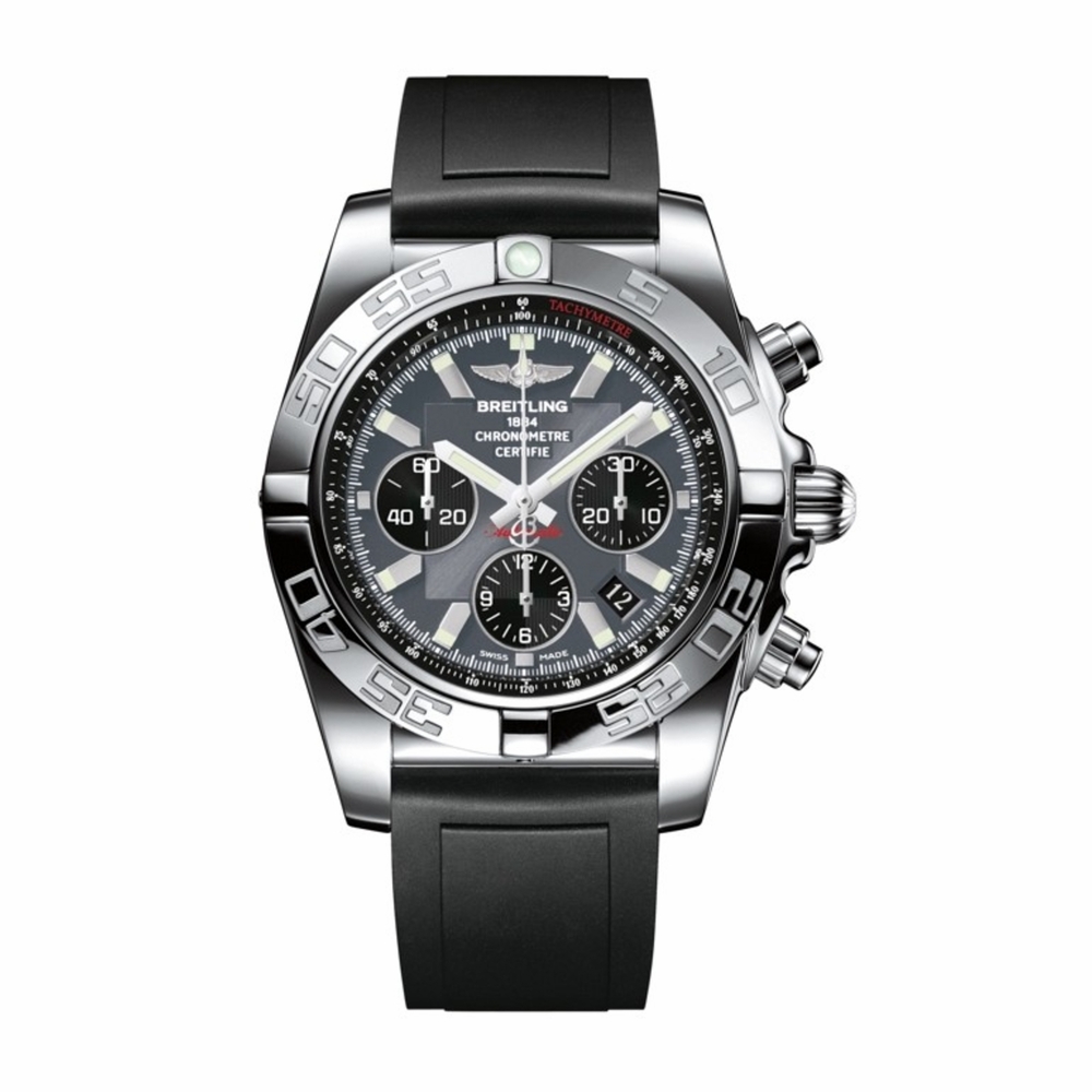 Silver-tone stainless steel case with a black rubber strap. Grey dial with silver-tone hands and index hour markers. Tachymeter. Dial Type: Analog. Luminescent hands and markers. Date display between 4 and 5 o'clock position. Chronograph - three sub-dials displaying: 60 second, 30 minute and 12 hours. Breitling Calibre B01 automatic movement with a 70-hour power reserve. Scratch resistant sapphire crystal. Screw down crown. Round case shape, case size: 44 mm. Water resistant at 500 meters / 1650 feet. Functions: chronograph, date, hour, minute, second. Chronomat Series. Dive watch style. Watch label: Swiss Made. Breitling Chronomat Chronograph Automatic Grey Dial Mens Watch AB011012/F546.131S.A20S.1.