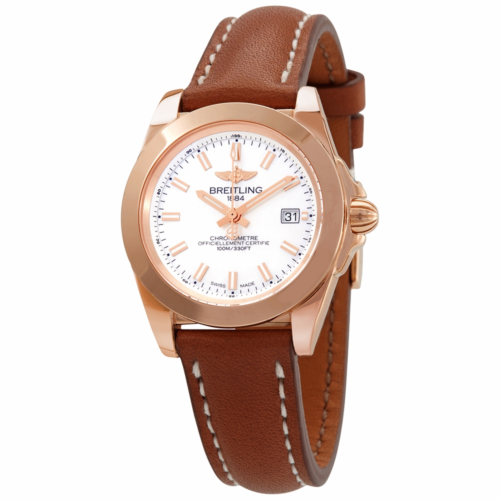 18kt rose gold case with a dark brown leather strap. Fixed bezel. White mother of pearl dial with rose gold-tone hands and index hour markers. Dial Type: Analog. Luminescent hands and markers. Date display at the 3 o'clock position. Quartz movement. Scratch resistant sapphire crystal. Pull / push crown. Round case shape, case size: 32 mm, case thickness: 10.79 mm. Band width: 16 mm. Tang clasp. Water resistant at 100 meters / 330 feet. Functions: date, hour, minute, second. Galactic 32 Series. Watch label: Swiss Made. Breitling Galactic 32 Quartz White Mother of Pearl Dial Ladies Watch H7133012/A802 406X-H14B.1.