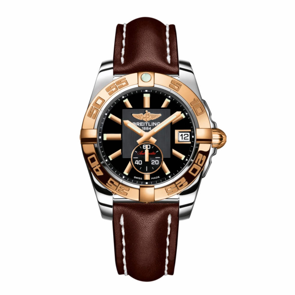 Silver-tone stainless steel case with a brown leather strap. Uni-directional rotating 18k rose gold bezel. Black dial with rose gold-tone hands and index hour markers. Minute markers around the outer rim. Dial Type: Analog. Luminescent hands and markers. Date display at the 3 o'clock position. One subdial displaying: one- small seconds. Breitling Calibre B37 automatic movement with a 42-hour power reserve. Scratch resistant sapphire crystal. Pull / push crown. Solid case back. Round case shape, case size: 36 mm. Tang clasp. Water resistant at 100 meters / 330 feet. Functions: date, hour, minute, second. Galactic 36 Series. Dress watch style. Watch label: Swiss Made. Breitling Galactic 36 Automatic Black Dial Ladies Watch C3733012/BA54.416X.A16BA.1.