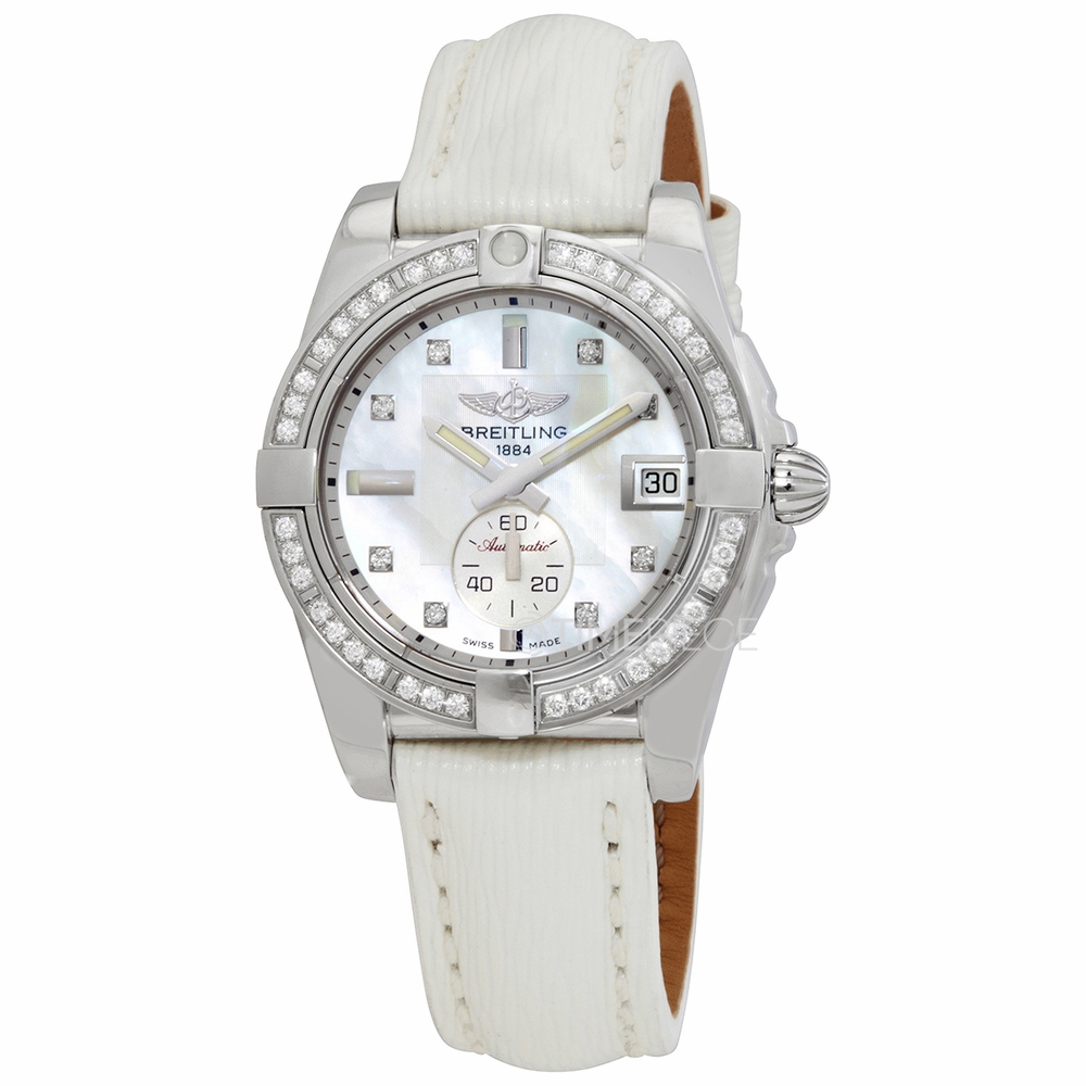 Silver-tone stainless steel case with a white sahara leather strap. Fixed bezel with diamond set. Mother of pearl dial with silver-tone hands and index-diamonds hour markers. Dial Type: Analog. Luminescent hands and markers. Date display at the 3 o'clock position. One subdial displaying: one- small seconds. Automatic movement. Scratch resistant sapphire crystal. Pull / push crown. Round case shape, case size: 36 mm. Water resistant at 100 meters / 330 feet. Functions: date, hour, minute, second. Galactic 36 Series. Luxury watch style. Watch label: Swiss Made. Breitling Galactic 36 Automatic Diamond Ladies Watch A3733053/A717.236X.A16BA.1.