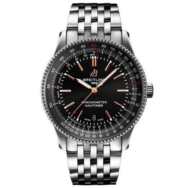 Stainless steel case with a stainless steel bracelet. Uni-directional rotating stainless steel bezel. Black dial with luminous rose gold-tone hands and index hour markers. Minute markers. Tachymeter markings around the outer rim. Dial Type: Analog. Luminescent hands and markers. Date display above o'clock position. Breitling caliber 17 automatic movement. Scratch resistant sapphire crystal. Push / pull crown Solid case back. Round case shape. Case size: 41 mm. Caseckness: 10.10 mm. Band width: 22 mm. Fold over clasp. Water resistant at 30 meters / 100 feet. Functions: date, hour, minute, second, tachymeter. Navitimer Series. Luxury watch style. Watch label: Swiss Made. Breitling Navitimer Automatic Black Dial Mens Watch A17326241B1A1.