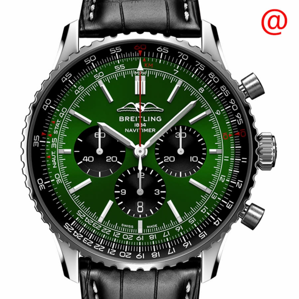 Silver-tone stainless steel case with a black alligator band. Bi-directional rotating silver-tone stainless steel bezel. Green dial with silver-tone hands and index hour markers. Minute markers around the outer rim. Dial Type: Analog. Date display at the 6 o'clock position. Chronograph - three sub-dials displaying: 60 second, 30 minute and 12 hour. Breitling Calibre 01 Automatic movement, containing 47 Jewels, composed of 346 parts, bitting at 28800 vph, and has a power reserve of approximately 70 hours. Scratch resistant sapphire crystal. Pull / push crown. Transparent see through case back. Round case shape, case size: 46 mm. Fold over clasp with a safety release. Water resistant at 30 meters / 100 feet. Functions: chronograph, column wheel, date, hour, minute, second, chronometer. Additional Info: original box, international warranty card, manual (complete accessories). Navitimer Series. Luxury watch style. Watch label: Swiss Made. Breitling Navitimer Chronograph Automatic Chronometer Green Dial Mens Watch AB0137241L1P1.