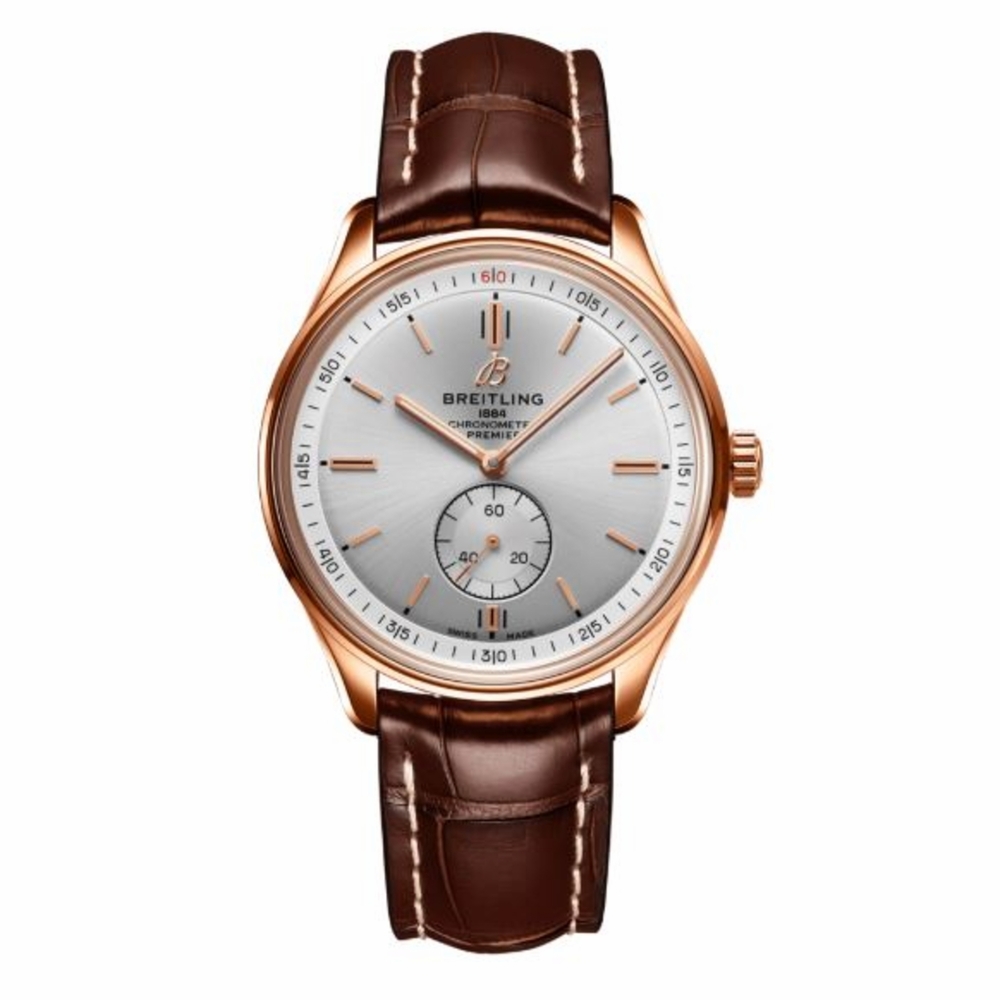 18kt rose gold case with a brown alligator band. 18kt rose gold bezel. Silver dial with index hour markers. Dial Type: Analog. One subdial displaying: small second. Breitling Calibre 37 Automatic movement, based upon ETA 2895-2, containing 27 Jewels, bitting at 28800 vph, and has a power reserve of approximately 42 hours. Scratch resistant sapphire crystal. Screw down crown. Solid case back. Round case shape, case size: 40 mm, case thickness: 11.40 mm. Water resistant at 100 meters / 330 feet. Functions: date, hour, minute, small second. Premier 40 Series. Watch label: Swiss Made. Breitling Premier 40 Automatic Silver Dial Mens Watch R37340351G1P1.