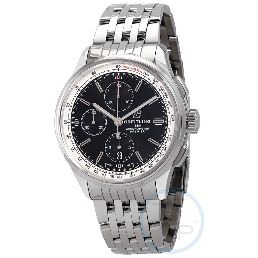 Silver-tone stainless steel case with a silver-tone stainless steel bracelet. Fixed silver-tone stainless steel bezel. Black dial with luminous silver-tone hands and index hour markers. Minute markers. tachymeter markers around the outer rim. Dial Type: Analog. Luminescent hands and markers. Date display at the 6 o'clock position. Chronograph - three sub-dials displaying: 60 seconds, 30 minutes, and 12 hours. Breitling Calibre 13 Automatic movement, based upon ETA Valjoux 7750, containing 25 Jewels, bitting at 28800 vph, and has a power reserve of approximately 42 hours. Scratch resistant sapphire crystal. Pull / push crown. Solid case back. Round case shape, case size: 42 mm, case thickness: 13.80 mm. Band width: 22 mm. Fold over with push button release clasp. Water resistant at 100 meters / 330 feet. Functions: chronograph, date, hour, minute, second, chronometer. Luxury watch style. Watch label: Swiss Made. Breitling Premier Chronograph Automatic Chronometer Black Dial Mens Watch A13315351B1A1.