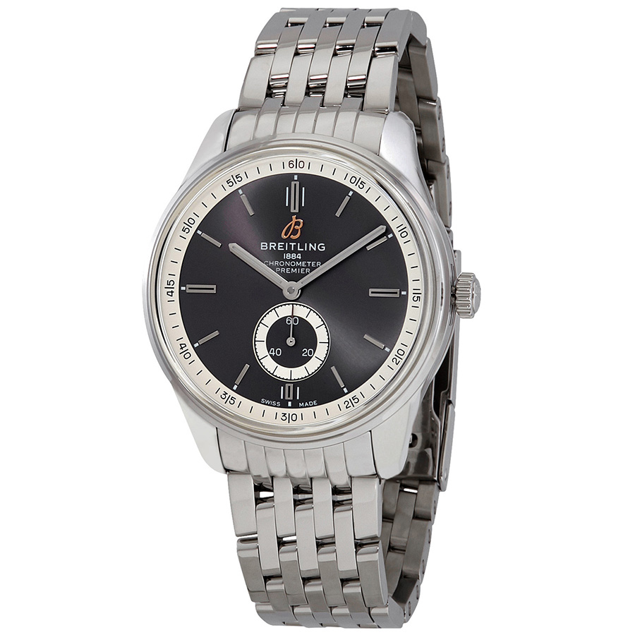 Stainless steel case with a stainless steel bracelet. Fixed stainless steel bezel. Anthracite dial with luminous silver-tone hands and index hour markers. Arabic numeral minute markers (at 5 minute intervals). Minute markers around the outer rim. Dial Type: Analog. Luminescent hands and markers. Small second sub-dial. Breitling calibre 37 automatic movement with a 42-hour power reserve. Scratch resistant sapphire crystal. Pull / push crown. Solid case back. Round case shape. Case size: 40 mm. Case thickness: 11.40 mm. Band width: 20 mm. Deployment clasp with a push button release. Water resistant at 100 meters / 330 feet. Functions: hour, minute, small second, chronometer. Luxury watch style. Watch label: Swiss Made. Breitling Premier Automatic Chronometer Anthracite Dial Mens Watch A37340351B1A1.