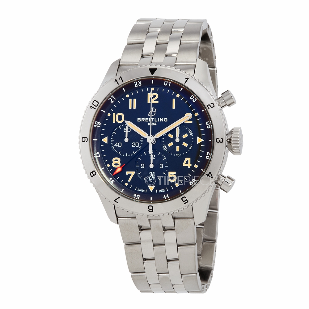 Silver-tone stainless steel case and bracelet. Bi-directional rotating silver-tone stainless steel bezel. Black dial with silver-tone hands and Arabic numeral hour markers. Minute markers around the outer rim. Dial Type: Analog. Date display at the 6 o'clock position. Chronograph - three sub-dials displaying: 60 second, 30 minute and 12 hour. Breitling Calibre 04 Automatic movement, based upon Breitling Calibre 01, containing 47 Jewels, bitting at 28000 vph, and has a power reserve of approximately 70 hours. Scratch resistant sapphire crystal. Transparent see through case back. Round case shape, case size: 46 mm, case thickness: 15.9 mm. Fold over clasp with a safety release. Water resistant at 100 meters / 330 feet. Functions: chronograph, date, GMT, second time zone, hour, minute, second, chronometer. Super Avi Series. Luxury watch style. Watch label: Swiss Made. Breitling Super Avi Chronograph Automatic Chronometer Black Dial Mens Watch AB04453A1B1A1.