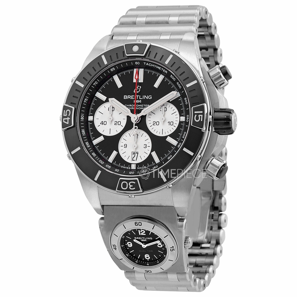 Stainless steel case with a stainless steel bracelet. Uni-directional rotating stainless steel bezel with an inlaid black ceramic ring. Black dial with luminous silver-tone hands and index hour markers. Minute markers. 1/100th second markers. Tachymeter markings around the outer rim. Dial Type: Analog. Luminescent hands and markers. Date display above the 6 o'clock position. Chronograph - three sub-dials displaying: 60 second, 30 minute and 12 hour. Breitling calibre 01 automatic movement, containing 47 Jewels, composed of 346 parts, bitting at 28800 vph, and has a power reserve of approximately 70 hours. Scratch resistant sapphire crystal. Screw down crown. Transparent case back. Round case shape. Case size: 44 mm. Case thickness: 14.4 mm. Band width: 22 mm. Fold over clasp with a safety release. Water resistant at 200 meters / 660 feet. Functions: chronograph, column wheel, date, hour, minute, second, chronometer. Super Chronomat B01 Series. Luxury watch style. Watch label: Swiss Made. Breitling Super Chronomat B01 Chronograph Automatic Chronometer Black Dial Mens Watch AB0136251B1A2.