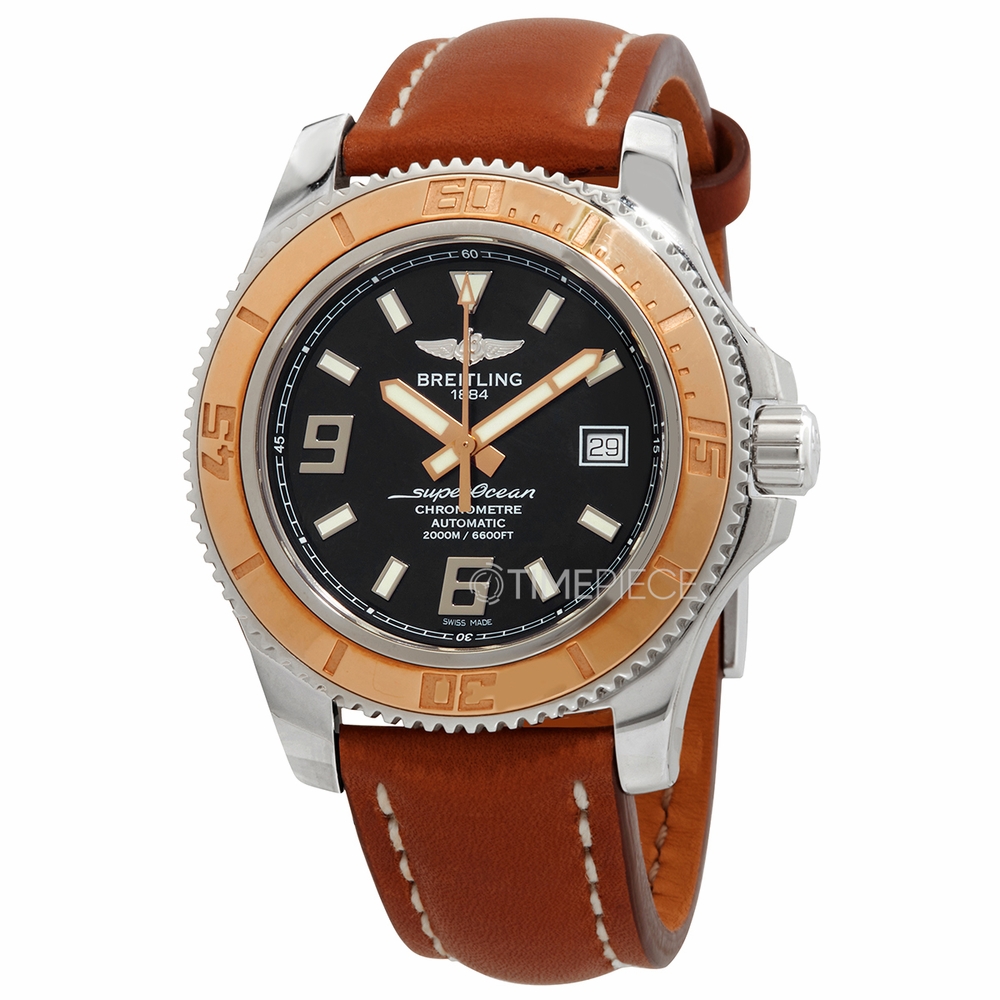 Silver-tone stainless steel case with a brown leather strap. Uni-directional rotating 18kt rose gold bezel. Black dial with rose gold-tone hands and index-Arabic numerals hour markers. Minute markers around the outer rim. Dial Type: Analog. Luminescent hands and markers. Date display at the 3 o'clock position. Automatic movement. Scratch resistant sapphire crystal. Screw down crown. Round case shape, case size: 44 mm. Tang clasp. Water resistant at 2000 meters / 6600 feet. Functions: date, hour, minute, second. Superocean 44 Series. Luxury watch style. Watch label: Swiss Made. Breitling Superocean 44 Automatic Black Dial Mens Watch C1739112/BA77.433X.A20BA.1.