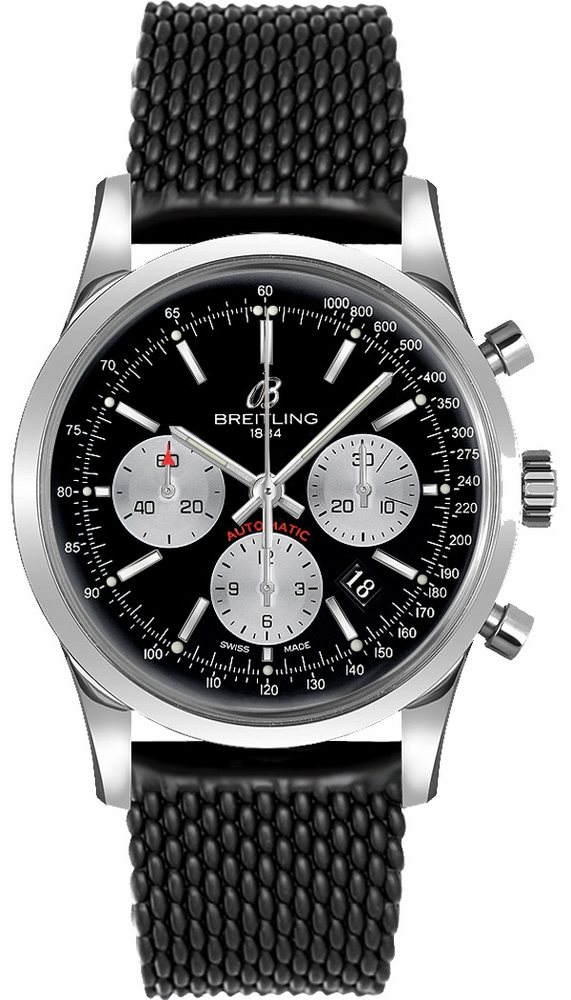 Silver-tone stainless steel case with a black rubber strap. Fixed silver-tone stainless steel bezel. Black dial with silver-tone hands and index hour markers. Minute markers around the outer rim. Dial Type: Analog. Luminescent hands and markers. Date display between 4 and 5 o'clock position. Chronograph - three sub-dials displaying: 60 second, 30 minute and 12 hour. Breitling Calibre 01 Automatic movement, containing 47 Jewels, composed of 346 parts, bitting at 28800 vph, and has a power reserve of approximately 70 hours. Scratch resistant sapphire crystal. Screw down crown. Transparent see through case back. Round case shape, case size: 43 mm. Buckle clasp. Water resistant at 100 meters / 330 feet. Functions: chronograph, column wheel, date, hour, minute, second, chronometer. Additional Info: original box, international warranty card, manual (complete accessories). Transocean Chronograph Series. Luxury watch style. Watch label: Swiss Made. Breitling Transocean Chronograph Automatic C