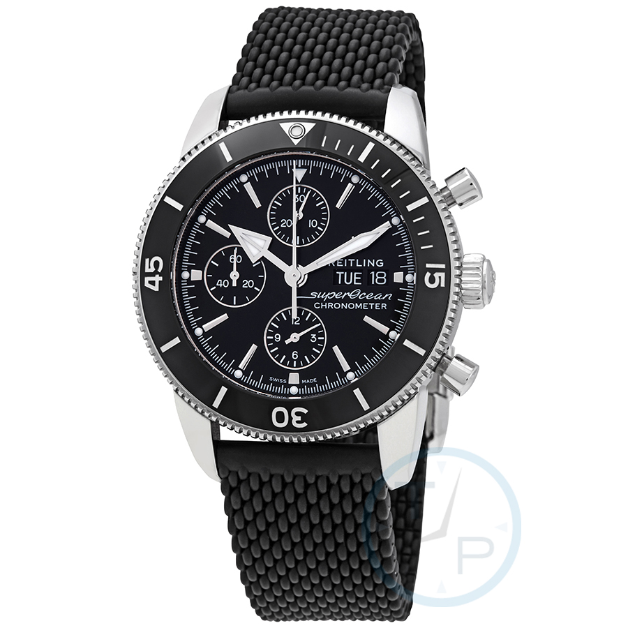 Silver-tone stainless steel case with a black rubber strap. Uni-directional rotating coin edge black ceramic ring stainless steel bezel. Black dial with luminous silver-tone arrow-shaped hands and index hour markers. Minute markers around the outer rim. Dial Type: Analog. Luminescent hands and markers. Day of the week and date display at the 3 o'clock position. Chronograph - three sub-dials displaying: 60 seconds, 30 minutes, and 12 hours. Breitling Calibre 13 Automatic movement, based upon ETA Valjoux 7750, containing 25 Jewels, bitting at 28800 vph, and has a power reserve of approximately 42 hours. Scratch resistant sapphire crystal. Screw locked crown. Solid case back. Round case shape, case size: 44 mm, case thickness: 15.65 mm. Band width: 22 mm. Fold over with push button release clasp. Water resistant at 200 meters / 660 feet. Functions: chronograph, date, day, hour, minute, second, chronometer. Superocean Heritage II Series. Luxury watch style. Watch label: Swiss Made. Item Variations: A1331312-BG49-279S-A20D.4. Breitling Superocean Heritage II Chronograph Automatic Chronometer Black Dial Mens Watch A13313121B1S1.