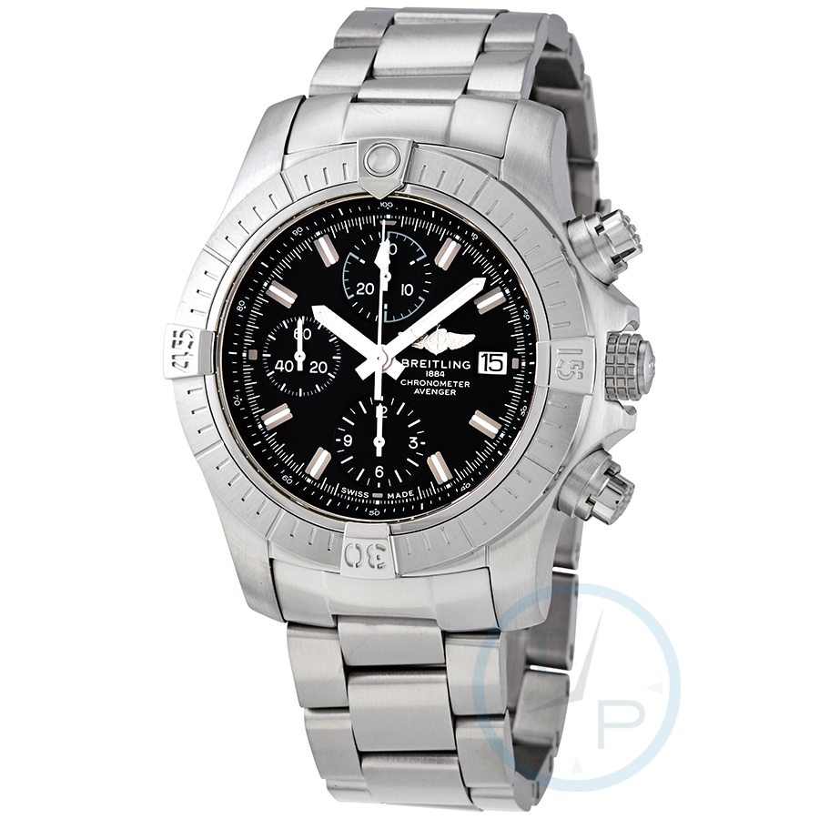 Silver-tone stainless steel case with a silver-tone stainless steel bracelet. Uni-directional rotating arabic numeral silver-tone stainless steel bezel. Black dial with luminous silver-tone hands and index hour markers. Minute markers. 1/100th second markers around the outer rim. Dial Type: Analog. Luminescent hands and markers. Date display at the 3 o'clock position. Chronograph - three sub-dials displaying: 60 second, 30 minute and 12 hour. Breitling Calibre 13 Automatic movement, based upon ETA Valjoux 7750, containing 25 Jewels, bitting at 28800 vph, and has a power reserve of approximately 42 hours. Scratch resistant sapphire crystal. Screw locked crown. Solid case back. Round case shape, case size: 43 mm, case thickness: 16.43 mm. Band width: 22/20 mm. Fold over with safety release clasp. Water resistant at 300 meters / 1000 feet. Functions: chronograph, date, hour, minute, second, chronometer. Dive watch style. Watch label: Swiss Made. Breitling Avenger Chronograph Automatic Black Dial Mens Watch A13385101B1A1.