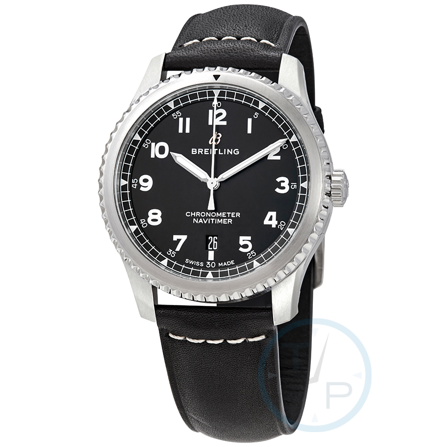 Stainless steel case with a black leather strap. Bi-directional rotating stainless steel bezel. Black dial with luminous silver-tone hands and Arabic numeral hour markers. Minute markers around the outer rim. Dial Type: Analog. Luminescent hands and markers. Date display at the 6 o'clock position. Breitling calibre 17 automatic movement, based upon ETA 2824-2, containing 25 Jewels, bitting at 28800 vph, and has a power reserve of approximately 42 hours. Scratch resistant sapphire crystal. Screw locked crown. Solid case back. Round case shape. Case size: 41 mm. Case thickness: 10.74 mm. Band width: 21 mm. Tang clasp. Water resistant at 100 meters / 330 feet. Functions: date, hour, minute, second, chronometer. Luxury watch style. Watch label: Swiss Made. Item Variations: A1731410-BG68-489X-A18BASA.6. Breitling Navitimer 8 Automatic Chronometer Black Dial Mens Watch A17314101B1X1.