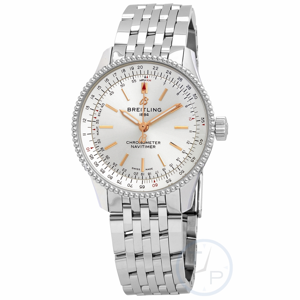 Stainless steel case and bracelet. Fixed beaded stainless steel bezel. Silver dial with luminous rose gold-tone hands and index hour markers. Tachymeter markers around the outer rim. Dial Type: Analog. Luminescent hands and markers. Breitling calibre 17 automatic movement, based upon ETA 2824-2, containing 25 Jewels, bitting at 28800 vph, and has a power reserve of approximately 42 hours. Scratch resistant sapphire crystal. Pull / push crown. Solid case back. Round case shape. Case size: 35 mm. Case thickness: 9.92 mm. Band width: 18 mm. Fold over clasp with a safety release. Water resistant at 30 meters / 100 feet. Functions: hour, minute, second, tachymeter. Navitimer 35 Series. Luxury watch style. Watch label: Swiss Made. Breitling Navitimer 35 Automatic Silver Dial Watch A17395F41G1A1.