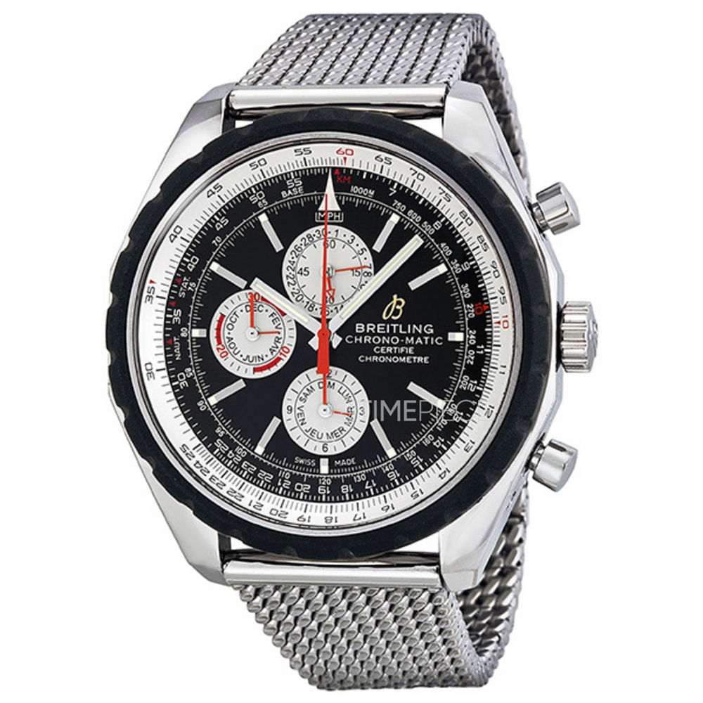 Stainless steel case with a stainless steel bracelet. Bi-directional rotating bezel. Black dial with silver-tone hands and stick hour markers. Minute markers Tachymeter (slide rule) around the outer rim. Dial Type: Analog. Luminescent hands and markers. Month, day of the week and date sub-dials. Chronograph / Multi-function - three dual sub-dials displaying: 60 second / date, 30 minute / month and 12 hour (GMT) / day of the week. Automatic movement. Scratch resistant sapphire crystal. Pull / push crown. Solid case back. Case diameter: 49 mm. Case thickness: 15 mm. Round case shape. Band width: 24 mm. Deployment clasp with push button. Water resistant at 30 meters / 100 feet. Functions: chronograph, month, day, date, hour, minute, second. Luxury watch style. Watch label: Swiss Made.