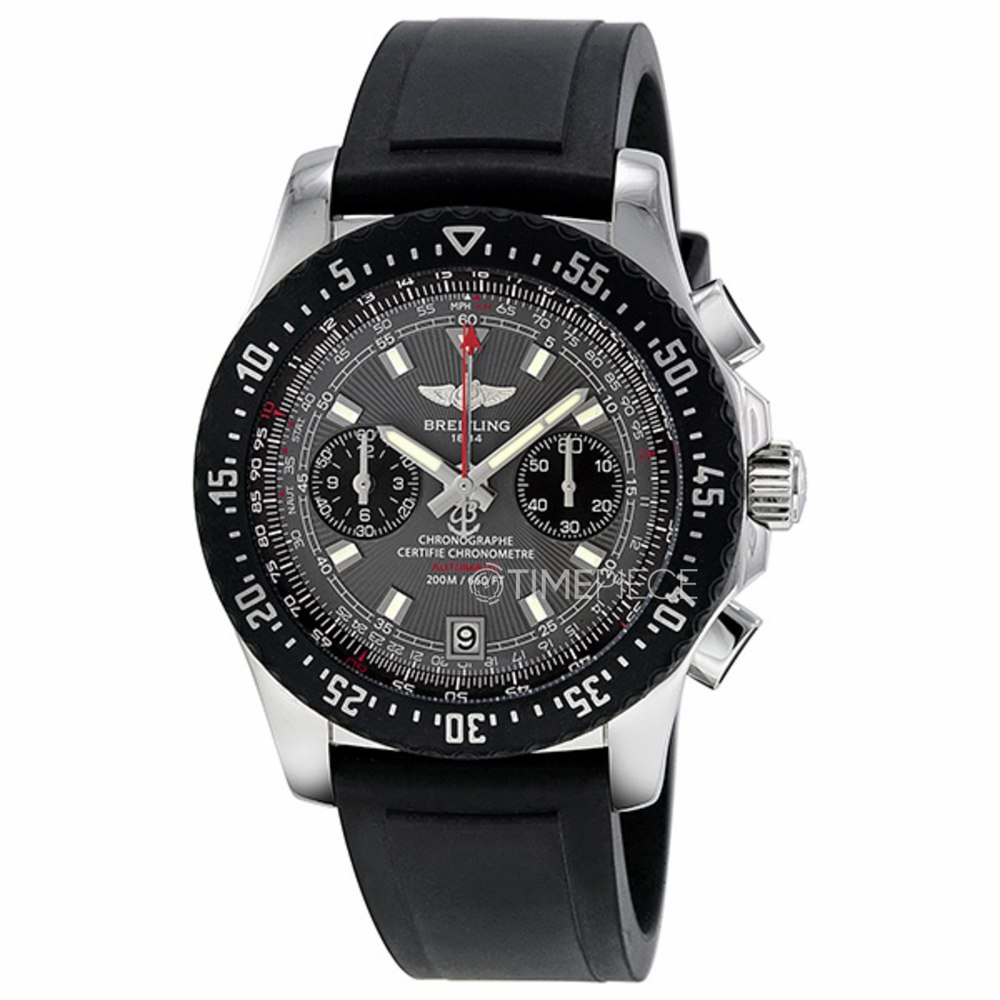 Stainless steel case with a black rubber strap. Bi-directional rotating bezel. Grey dial with luminous hands and index hour markers. Tachymeter (mile / kilometer conversion scale) scale appears around the outer rim. Dial Type: Analog. Date display at the 6 o'clock position. Chronograph - three sub-dials displaying: 60 second, 60 minute and 12 hour. Automatic movement. Scratch resistant sapphire crystal. Case diameter: 43.5 mm. Case thickness: 16 mm. Round case shape. Tang clasp. Water resistant at 200 meters / 660 feet. Functions: chronograph, date, hour, minute, second. Luxury watch style. Watch label: Swiss Made. Breitling Skyracer Raven Chronograph Automatic Mens Watch A2736423-F532BKPT.