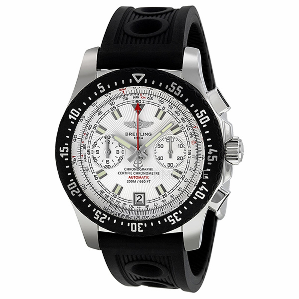 Stainless steel case with a black ocean racer rubber strap. Bi-directional rotating black ion-plated bezel. Silver dial with luminous hands and index hour markers. Minute markers. Tachymeter (Mile / Kilometer conversion) scale appears around the outer rim. Dial Type: Analog. Date display at the 6 o'clock position. Chronograph - two sub-dials: dual 60 second / 12 hour and 60 minute. Selfwinding automatic chronometer movement. Scratch resistant sapphire crystal. Screw locked crown. Case diameter: 43.50 mm. Case thickness: 16 mm. Round case shape. Deployment clasp. Water resistant at 200 meters / 660 feet. Functions: chronograph, date, hour, minute, second. Luxury watch style. Watch label: Swiss Made. Breitling Skyracer Raven Silver Dial Chronograph Black Rubber Mens Watch A2736434-G615BKOR.