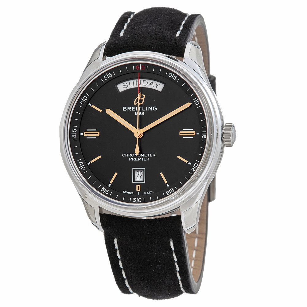 Silver-tone stainless steel case with a black (calfskin) leather strap. Fixed silver-tone stainless steel bezel. Black dial with luminous rose gold-tone hands and index hour markers. Minute markers around the outer rim. Dial Type: Analog. Luminescent hands and markers. Date display at the 6 o'clock position. day of the week display centered on the 12 o'clock position. Breitling Calibre 45 Automatic movement, based upon ETA 2834-2, containing 25 Jewels, bitting at 28800 vph, and has a power reserve of approximately 42 hours. Scratch resistant sapphire crystal. Pull / push crown. Solid case back. Round case shape, case size: 40 mm, case thickness: 11.4 mm. Band width: 20/18 mm. Tang clasp. Water resistant at 100 meters / 330 feet. Functions: date, day, hour, minute, second. Premier automatic day and date series. Luxury watch style. Watch label: Swiss Made. Breitling Premier Automatic Day and Date Chronometer Black Dial Watch A45340241B1X4.