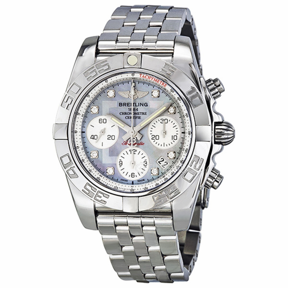 Stainless steel case with a stainless steel bracelet. Uni-directional rotating stainless steel bezel. Mother of pearl dial with silver-tone hands and diamond hour markers. Minute markers. Telemeter around the outer rim. Dial Type: Analog. Luminescent hands and markers. Date display appears between the 4 and 5 o'clock positions. Chronograph - three white sub-dials displaying: 60 second, 30 minute and 12 hour. Automatic movement. Scratch resistant sapphire crystal. Screw locked crown. Solid case back. Case diameter: 41 mm. Case thickness: 15.4 mm. Round case shape. Band width: 20 mm. Fold over clasp with safety release. Water resistant at 300 meters / 1000 feet. Functions: chronograph, date, hour, minute, second. Luxury watch style. Watch label: Swiss Made. Breitling Chronomat 41 Automatic Diamond Mother of Pearl Dial Mens Watch AB014012-G712SS.