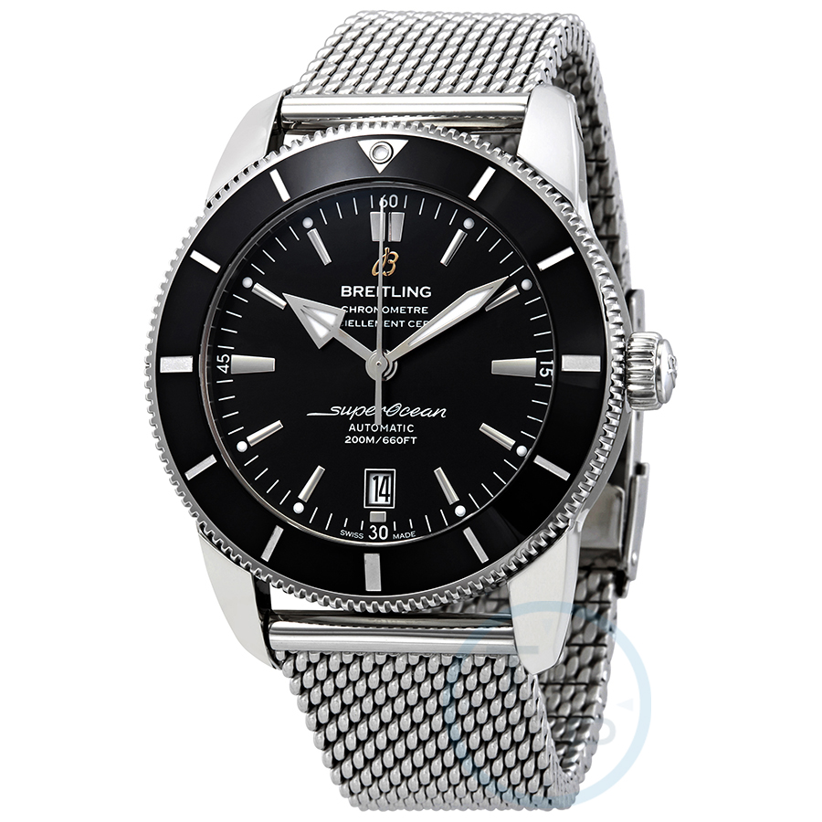 Stainless steel case with a stainless steel mesh bracelet. Uni-directional rotating stainless steel bezel with a black ceramic top ring. Black dial with luminous silver-tone hands and index hour markers. Minute markers around the outer rim. Dial Type: Analog. Luminescent hands and markers. Date display at the 6 o'clock position. Breitling calibre B20 automatic movement with a 70-hour power reserve. Scratch resistant sapphire crystal. Screw down crown. Solid case back. Round case shape. Case size: 46 mm. Case thickness: 15 mm. Band width: 24 mm / 20 mm. Fold over clasp with a push button release. Water resistant at 200 meters / 660 feet. Functions: date, hour, minute, second. Luxury watch style. Watch label: Swiss Made. Item Variations: AB202012-BF74-152A. Breitling Superocean Heritage II Automatic Black Dial Mens Watch AB2020121B1A1.
