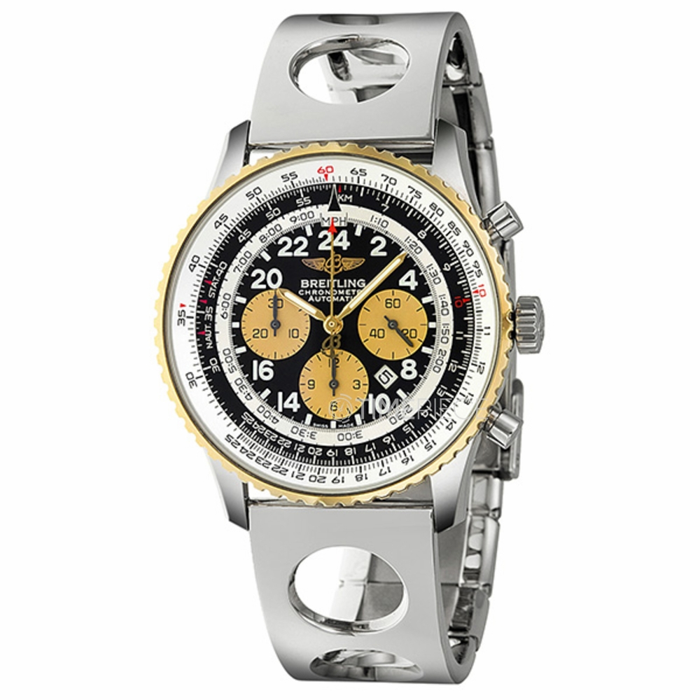 Stainless steel case with a stainless steel air racer bracelet. Bidirectional bezel. Black dial with luminous hands and Arabic hour markers. Tachymeter scale appears around the outer rim. Dial Type: Analog. Date display between 4 and 5 o'clock position. Chronograph - three sub-dials displaying: 60 second, 30 minute and 12 hour. Automatic movement. Scratch resistant sapphire crystal. Pull / push crown. Case diameter: 41.5 mm. Case thickness: 14.4 mm. Round case shape. Fold over clasp. Water resistant at 30 meters / 100 feet. Functions: chronograph, date, hour, minute, second. Luxury watch style. Watch label: Swiss Made. Breitling Cosmonaute Black Dial Steel Air Racer Automatic Mens Watch D22322P6-BA20SS.
