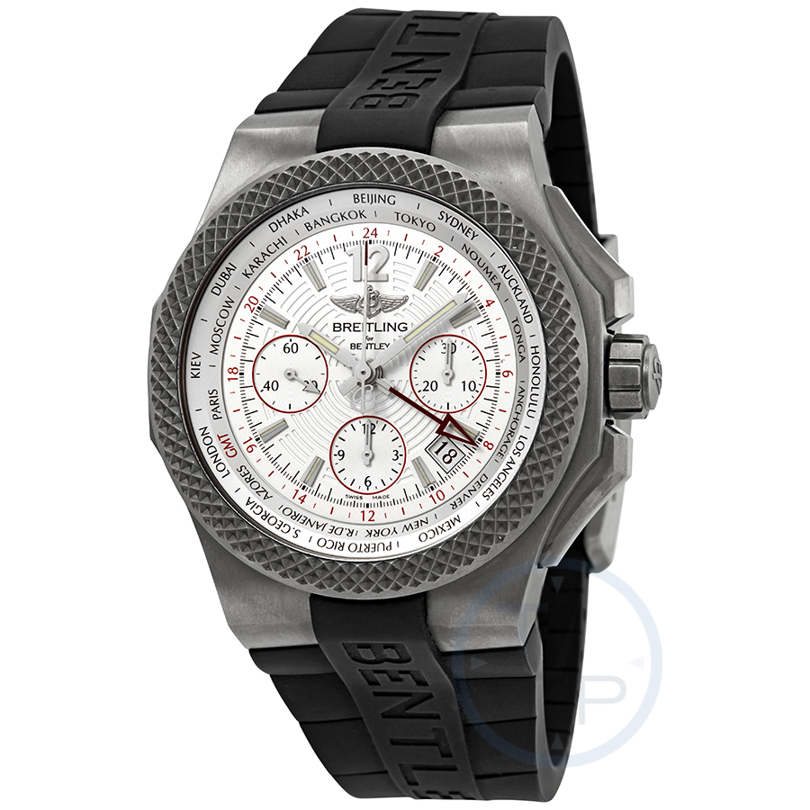 Grey titanium case with a black (Bentley II) rubber strap. Bi-directional rotating grey titanium bezel. Storm silver dial with luminous silver-tone hands and index hour markers. An Arabic numeral appears at the 12 o'clock position. Minute markers. 24 hour markers. World time cities around the outer rim. Dial Type: Analog. Luminescent hands and markers. Date display between 4 and 5 o'clock position. Chronograph - three sub-dials displaying: 60 second, 30 minute and 12 hours. Breitling calibre B04 automatic movement with a 70-hour power reserve. Scratch resistant sapphire crystal. Screw locked crown. Solid case back. Round case shape. Case size: 45 mm. Deployment clasp. Water resistant at 100 meters / 330 feet. Functions: GMT, second time zone, hour, minute, second, date, chronograph. Luxury watch style. Watch label: Swiss Made. Breitling Bentley GMT Chronograph Automatic Mens Watch EB043335/G801-232S.