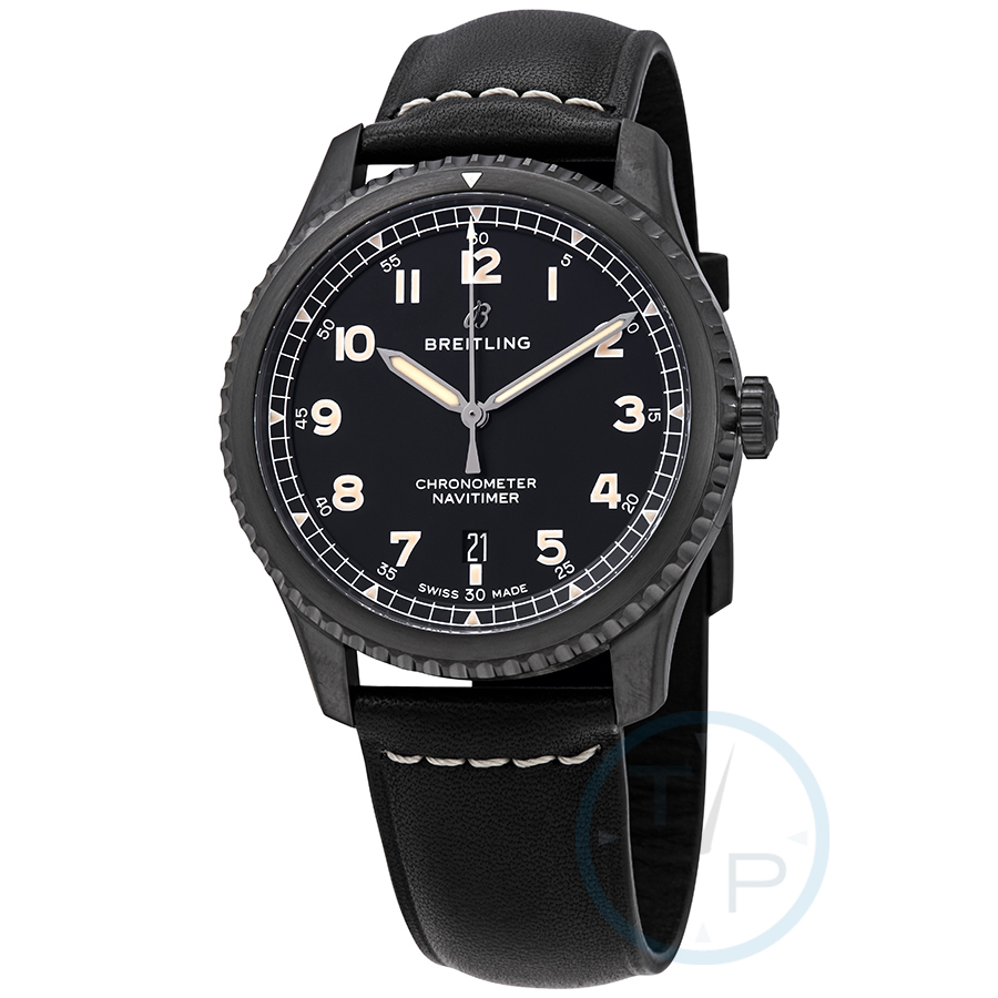 Black stainless steel case with a black leather strap. Bi-directional rotating black stainless steel bezel. Black dial with luminous silver-tone hands and Arabic numeral hour markers. Minute markers around the outer rim. Dial Type: Analog. Luminescent hands and markers. Date display at the 6 o'clock position. Breitling calibre 17 automatic movement with a 42-hour power reserve. Scratch resistant sapphire crystal. Screw locked crown. Solid case back. Round case shape. Case size: 41 mm. Case thickness: 10.74 mm. Band width: 21 mm. Tang clasp. Water resistant at 100 meters / 330 feet. Functions: date, hour, minute, second, chronometer. Luxury watch style. Watch label: Swiss Made. Breitling Navitimer 8 Automatic Chronometer Black Dial Mens Watch M17314101B1X1.