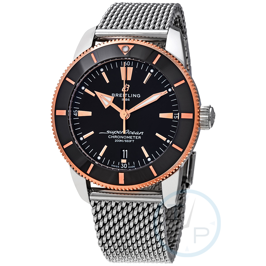 Stainless steel case with a stainless steel mesh bracelet. Uni-directional rotating 18kt rose gold bezel with black ceramic ring. Black dial with luminous rose gold hands and index hour markers. Minute markers around the outer rim. Dial Type: Analog. Luminescent hands and markers. Date display at the 6 o'clock position. Breitling calibre 20 automatic movement with a 70-hour power reserve. Scratch resistant sapphire crystal. Screw locked crown. Solid case back. Round case shape. Case size: 44 mm. Case thickness: 14.55 mm. Band width: 22 mm. Fold over clasp with a safety release. Water resistant at 200 meters / 660 feet. Functions: date, hour, minute, second, chronometer. Luxury watch style. Watch label: Swiss Made. Item Variations: UB203012-BG52-154A. Breitling Superocean Heritage II Automatic Chronometer Black Dial Mens Watch UB2030121B1A1.