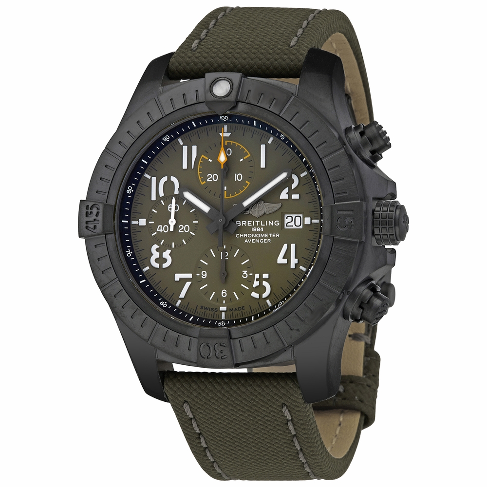 Black titanium case with a khaki green leather strap. Uni-directional rotating black titanium bezel. Khaki green dial with luminous black hands and Arabic numeral hour markers. Minute markers. 1/100th second markers around the outer rim. Dial Type: Analog. Luminescent hands and markers. Date display at the 3 o'clock position. Chronograph - three sub-dials displaying: 60 second, 30 minute and 12 hour. Breitling calibre 13 automatic movement. based upon ETA Valjoux 7750, containing 25 Jewels, bitting at 28800 vph, and has a power reserve of approximately 42 hours. Scratch resistant sapphire crystal. Screw down crown. Solid case back. Round case shape. Case size: 45 mm. Case thickness: 16.46 mm. Band width: 22 mm. Fold over / tang clasp. Water resistant at 300 meters / 1000 feet. Functions: chronograph, date, hour, minute, second, chronometer. Avenger Night Mission Series. Luxury watch style. Watch label: Swiss Made. Breitling Avenger Night Mission Chronograph Automatic Chronometer Khaki Green Dial Mens Watch V13317101L1X2.