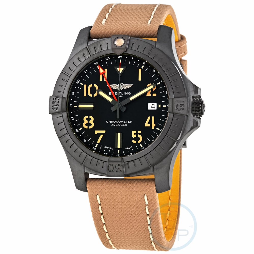 Black titanium case with a sand military leather strap. Uni-directional rotating black titanium bezel. Black dial with luminous black hands and Arabic numeral hour markers. Minute markers. 24 hour markers around the outer rim. Dial Type: Analog. Luminescent hands and markers. Date display at the 3 o'clock position. Breitling calibre 32 automatic movement, based upon ETA 2893-2, containing 21 Jewels, bitting at 28800 vph, and has a power reserve of approximately 42 hours. Scratch resistant sapphire crystal. Screw locked crown. Solid case back. Round case shape. Case size: 45 mm. Case thickness: 12.31 mm. Band width: 22 mm. Tang clasp. Water resistant at 300 meters / 1000 feet. Functions: date, GMT, second time zone, hour, minute, chronometer. Luxury watch style. Watch label: Swiss Made. Breitling Avenger Night Mission Automatic Chronometer Black Dial Mens Watch V32395101B1X1.