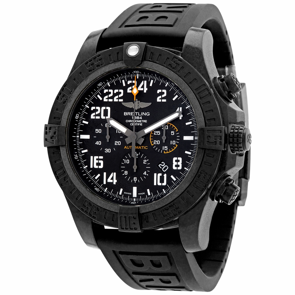 Black ultralight polymer (Breitlight) case with a black fabric (Diver Pro III) strap. Uni-directional rotating black ultralight polymer (Breitlight) bezel. Black dial with luminous grey hands and Arabic numeral (24 hour scale) markers. Minute markers. 1/10th second markers around the outer rim. Dial Type: Analog. Luminescent hands and markers. Date display between the 4 and 5 o'clock positions. Chronograph - three sub-dials displaying: 60 second, 30 minute and 12 hour. Breitling caliber B01 automatic movement with a 70-hour power reserve. Scratch resistant sapphire crystal. Screw down crown. Solid case back. Round case shape. Case size: 50 mm. Case thickness: 16.97 mm. Band width: 24 mm. Deployment clasp with a push button release. Water resistant at 100 meters / 330 feet. Functions: chronograph, column wheel, date, hour, minute, second, chronometer. Avenger Hurricane 50 Series. Luxury watch style. Watch label: Swiss Made. Breitling Avenger Hurricane 50 Chronograph Automatic Chronometer Black Dial Mens Watch XB1210E41B1S1.