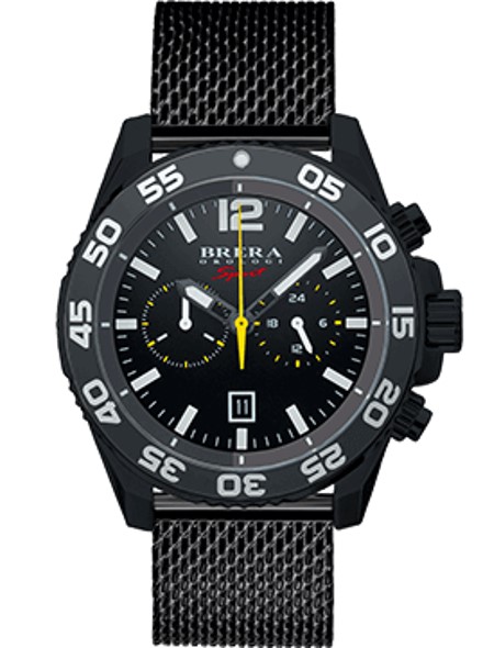 Black ion-plated 316L stainless steel case with a black ion-plated 316L stainless steel mesh bracelet. Uni-directional rotating black ion-plated stainless steel with an inlaid black ring. Black dial with luminous black hands and index hour markers. An Arabic numeral appears at the 12 o'clock position. Minute markers around the outer rim. Dial Type: Analog. Luminescent hands and markers. Date display at the 6 o'clock position. Chronograph - two sub-dials displaying: 24 hours and 30 minutes. Miyota OS 21 quartz movement. Scratch resistant mineral crystal. Pull / push crown. Solid case back. Round case shape. Case size: 44 mm. Case thickness: 12 mm. Band width: 22 mm. Fold over slip through clasp. Water resistant at 100 meters / 330 feet. Functions: chronograph, date, hour, minute, second. Mistral Series. Sport watch style. Brera Orologi Mistral Chronograph Quartz Black Dial Mens Watch BRSPMIC4403-BLK-MIL.