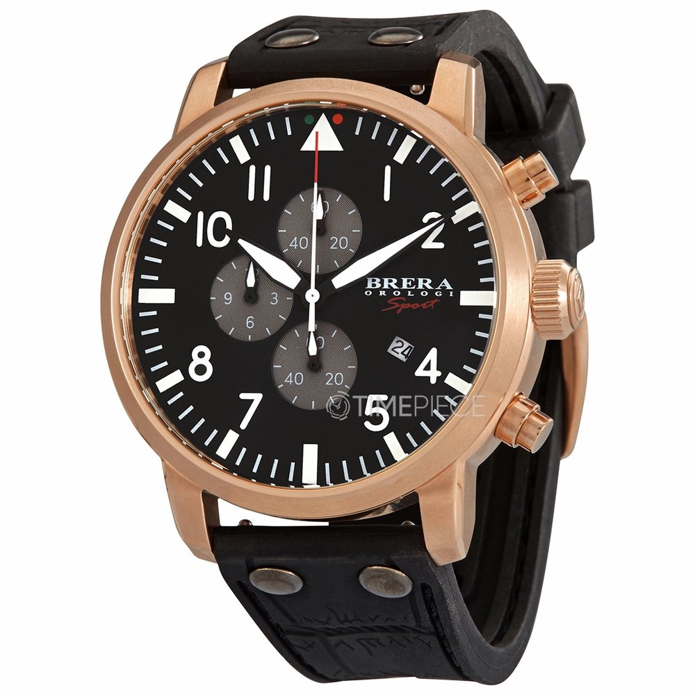 Rose gold-tone stainless steel case with a black rubber strap. Fixed rose gold-tone bezel. Black dial with luminous black hands and Arabic numeral hour markers. Minute markers around the outer rim. Dial Type: Analog. Luminescent hands. Date display at the 4 o'clock position. Chronograph - three sub-dials displaying: 60 second, 60 minute and 12 hour. Quartz movement. Scratch resistant mineral crystal. Solid case back. Round case shape. Case size: 44 mm. Case thickness: 11 mm. Band width: 22 mm. Tang clasp. Water resistant at 100 meters / 330 feet. Functions: chronograph, date, hour, minute, second. Tornado Series. Casual watch style. Brera Orologi Tornado Chronograph Quartz Black Dial Mens Watch BRSPTOC4402-BLK-CRUB.