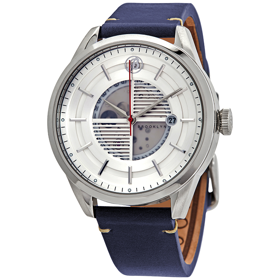 Silver-tone stainless steel case with a blue leather strap. Fixed silver-tone stainless steel bezel. Silver-tone dial with silver-tone hands and index hour markers. Minute markers around the outer rim. Dial Type: Analog. Date display at the 3 o'clock position. Miyota Caliber 8215 automatic movement with a 42-hour power reserve. Scratch resistant mineral crystal. Pull / push crown. Transparent case back. Round case shape. Case size: 42 mm. Band width: 20 mm. Tang clasp. Water resistant at 30 meters / 100 feet. Functions: date, hour, minute, second. Casual watch style. Watch label: Japan Movt. Brooklyn Watch Co. Wyckoff Automatic Silver Dial Mens Watch 8353A5.