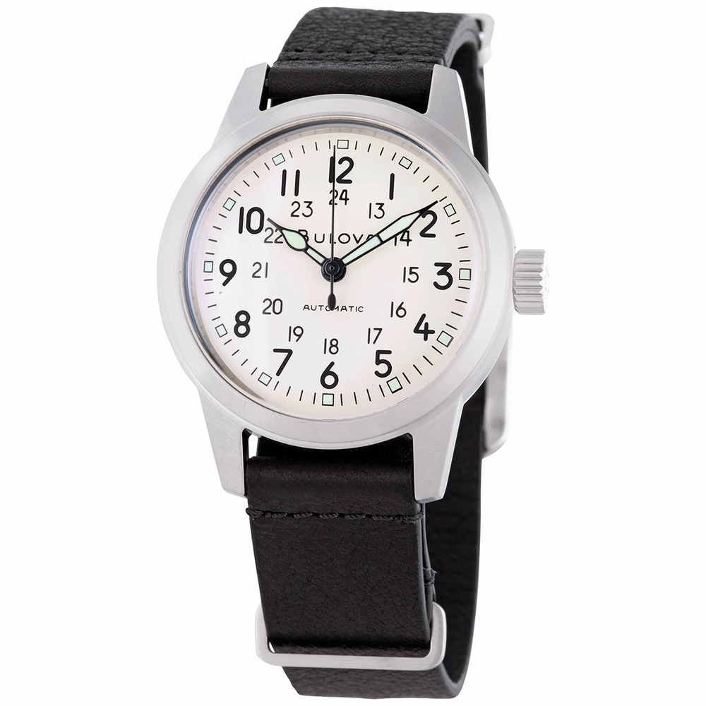 Stainless steel case with a black leather NATO strap. Fixed stainless steel bezel. Ivory dial with luminous black hands and Arabic numeral hour markers. 24 hour markers. Minute markers around the outer rim. Dial Type: Analog. Luminescent hands and markers. Automatic movement with a 42-hour power reserve. Scratch resistant mineral crystal. Pull / push crown. Solid case back. Round case shape. Case size: 38 mm. Case thickness: 13.45 mm. Band width: 18 mm. Tang clasp. Water resistant at 30 meters / 100 feet. Functions: hour, minute, second. Military watch style. Bulova Hack Automatic Ivory Dial Mens Watch 96A246.