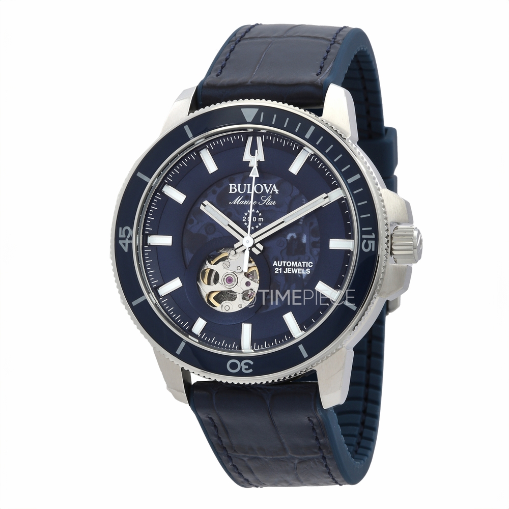 Silver-tone stainless steel case with a blue alligator leather strap with a silicone base. Uni-directional rotating silver-tone stainless steel bezel with an inlaid blue ring. Blue dial with silver-tone hands and index hour markers. Minute markers around the outer rim. Dial Type: Analog. Luminescent hands and markers. Miyota Calibre 8N26 automatic movement. Scratch resistant mineral crystal. Transparent case back. Round case shape, case size: 45 mm. Band width: 22 mm. Tang clasp. Water resistant at 200 meters / 660 feet. Functions: hour, minute, second. Marine Star Series. Sport watch style. Bulova Marine Star Automatic Blue Dial Mens Watch 96A291.