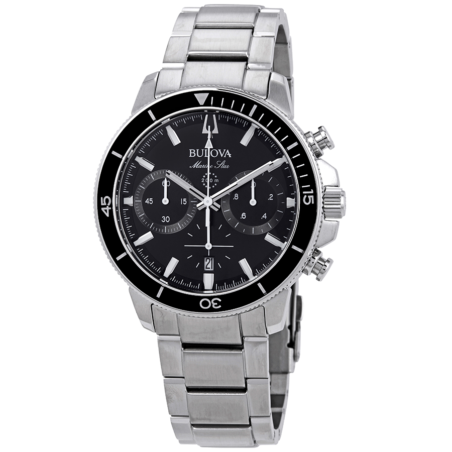 Stainless steel case with a stainless steel bracelet. Uni-directional rotating stainless steel bezel with a black ring. Black dial with luminous silver-tone hands and index hour markers. Minute markers around the outer rim. Dial Type: Analog. Luminescent hands and markers. Date display at the 6 o'clock position. Chronograph - three sub-dials displaying: 60 second, 60 minute and 1/10th of a second. Quartz movement. Scratch resistant mineral crystal. Screw down crown. Solid case back. Round case shape. Case size: 45 mm. Case thickness: 14.3 mm. Band width: 21.7 mm. Fold-over clasp. Water resistant at 200 meters / 660 feet. Functions: chronograph, date, hour, minute, second. Additional Info: in general, suitable for professional marine activity and serious surface water sports, but not diving. Sport watch style. Bulova Marine Star Chronograph Black Dial Mens Watch 96B272.