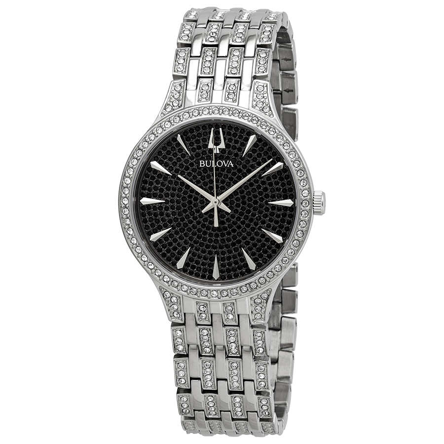 Stainless steel case with a stainless steel bracelet set with Swarovski crystals. Fixed stainless steel bezel set with Swarovski crystals. Black pave dial with silver-tone hands and index hour markers. Dial Type: Analog. Quartz movement. Scratch resistant mineral crystal. Pull / push crown. Solid case back. Round case shape. Case size: 40 mm. Case thickness: 7.1 mm. Band width: 22 mm. Deployment clasp. Water resistant at 30 meters / 100 feet. Functions: hour, minute, second. Dress watch style. Bulova Phantom Black Pave Dial Mens Watch 96A227.