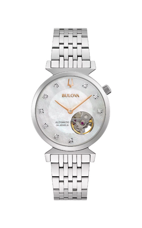 Stainless steel case with a stainless steel bracelet. Fixed stainless steel bezel. White mother of pearl (open heart) dial with rose gold-tone hands and diamond hour markers. Dial Type: Analog. 9029-20A automatic movement with a 42-hour power reserve. Scratch resistant sapphire crystal. Pull / push crown. Transparent case back. Round case shape. Case size: 32.2 mm. Fold over clasp. Water resistant at 30 meters / 100 feet. Functions: hour, minute, second. Regatta Series. Dress watch style. Bulova Regatta Automatic Diamond White Mother of Pearl Dial Ladies Watch 96P222.