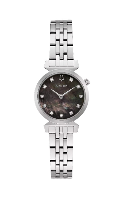 Stainless steel case with a stainless steel bracelet. Fixed stainless steel bezel. Black mother of pearl dial with silver-tone hands and diamond hour markers. Dial Type: Analog. Quartz movement. Scratch resistant sapphire crystal. Pull / push crown. Solid case back. Round case shape. Case size: 24 mm. Case thickness: 5.5 mm. Hidden fold over clasp. Water resistant at 30 meters / 100 feet. Functions: hour, minute. Additional Info: crown at the 2 o’clock position. Casual watch style. Bulova Regatta Diamond Black Mother of Pearl Dial Ladies Watch 96P221.