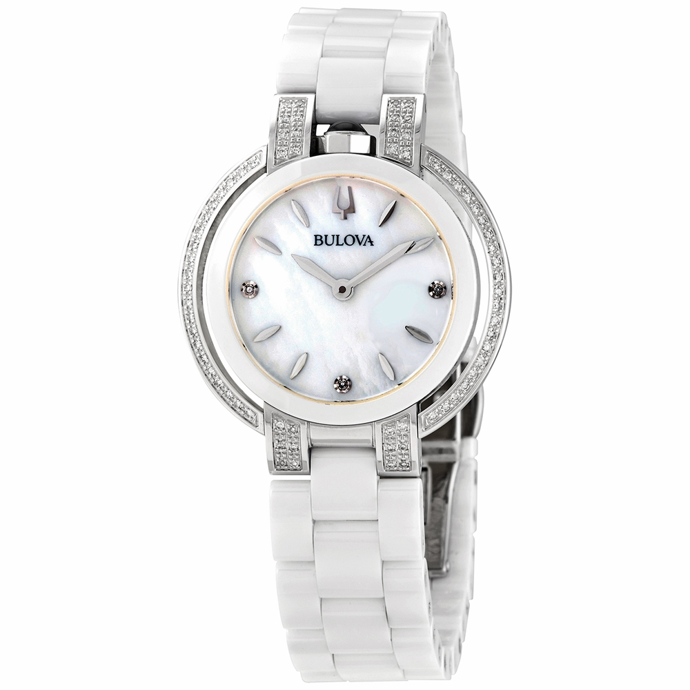 White ceramic case with a white ceramic bracelet. Fixed white ceramic with stainless steel set with diamonds bezel. Mother of pearl dial with silver-tone hands and index hour markers. Diamonds set at the 3, 6 and 9 o'clock positions. Dial Type: Analog. Quartz movement. Scratch resistant sapphire crystal. Synthetic blue spinel cabochon crown. Solid case back. Round case shape, case size: 36 mm, case thickness: 8.45 mm. Band width: 18 mm. Deployment with push button release clasp. Water resistant at 30 meters / 100 feet. Functions: hour, minute. Additional Info: synthetic blue spinel cabochon crown at the 12 o’clock position, and 73 diamonds. Casual watch style. Bulova Rubaiyat Mother of Pearl Dial Diamond Ladies Watch 98R265.