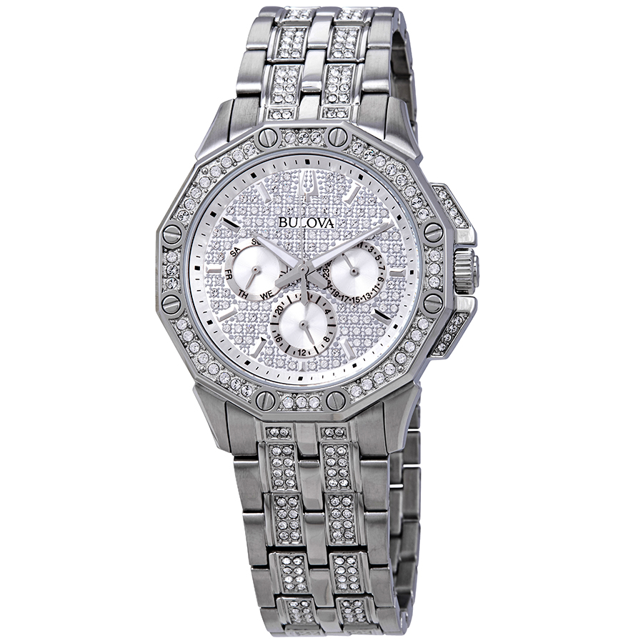Stainless steel case with a stainless steel bracelet set with crystals. Fixed stainless steel bezel set with crystals. Crystal pave dial with luminous silver-tone hands and index hour markers. Minute markers around the outer rim. Dial Type: Analog. Luminescent hands. Date display at the 3 o'clock position. Three multi-function sub-dials displaying: - 24 hour, date and day of the week. Quartz movement. Scratch resistant mineral crystal. Pull / push crown. Solid case back. Round case shape. Case size: 42 mm. Case thickness: 9.8 mm. Band width: 21.5 mm. Deployment clasp. Water resistant at 30 meters / 100 feet. Functions: date, day, hour, minute. Additional Info: Watch set with 300 Swarovski crystals. In general, withstands splashes or brief immersion in water, but not suitable for swimming or bathing. Dress watch style. Bulova Multifunction Crystal Pave Dial Mens Mens Watch 96C134.