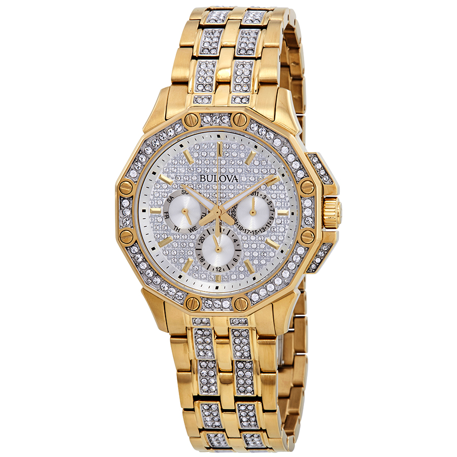 Yellow gold-tone stainless steel case with a yellow gold-tone stainless steel bracelet set with Swarovski crystals. Fixed yellow gold-tone bezel set with Swarovski crystals. Silver crystal-set dial with luminous yellow gold-tone hands and index hour markers. Minute markers around the outer rim. Dial Type: Analog. Luminescent hands. Three sub-dials displaying: day of the week, date, and 24 hour. Quartz movement. Scratch resistant mineral crystal. Pull / push crown. Solid case back. Round case shape, case size: 41.7 mm, case thickness: 10 mm. Band width: 22 mm. Deployment clasp. Water resistant at 30 meters / 100 feet. Functions: multifunction: date, day, hour, minute, second. Additional Info: 308 swarovski crystals encrusted in the bezel, band and pave dial. Dress watch style. Bulova Crystal Silver Dial Yellow Gold-tone Mens Watch 98C126.