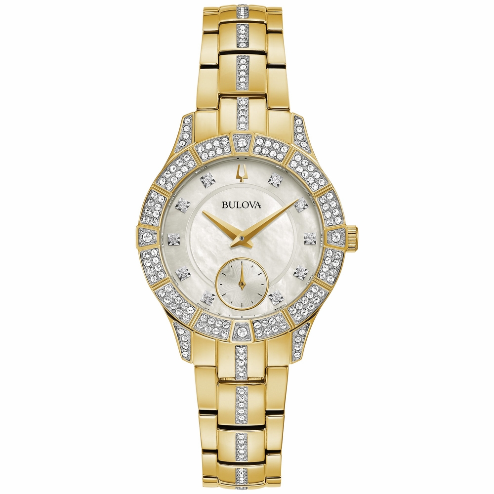Gold-tone stainless steel case with a gold-tone stainless steel bracelet set with Swarovski crystals. Fixed gold-tone bezel set with Swarovski crystals. Mother of pearl dial with gold-tone hands and diamond hour markers. Dial Type: Analog. Small seconds sub-dial. Quartz movement. Scratch resistant mineral crystal. Pull / push crown. Solid case back. Round case shape. Case size: 30.5 mm. Band width: 12 mm. Fold over clasp with a push button release. Water resistant at 30 meters / 100 feet. Functions: hour, minute, second. Additional Info: dial embellished with 174 Swarovski crystals. Dress watch style. Bulova Quartz Diamond Crystal Mother of Pearl Dial Ladies Watch 98L283.