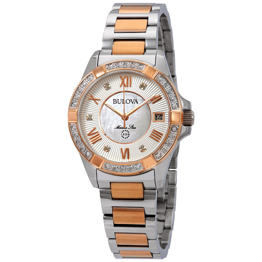 Stainless steel case with a two-tone (silver-tone and rose gold-tone) stainless steel bracelet. Fixed rose gold-tone bezel set with diamonds. White mother of pearl dial with luminous rose gold-tone hands and alternating Roman numeral and diamond hour markers. Dial Type: Analog. Luminescent hands. Date display at the 3 o'clock position. Quartz movement. Scratch resistant sapphire crystal. Pull / push crown. Solid case back. Round case shape. Case size: 32 mm. Case thickness: 10 mm. Band width: 16 mm. Deployment clasp with a push button release. Water resistant at 30 meters / 100 feet. Functions: hour, minute, second. Additional Info: 23 diamonds hand set on rose gold-tone bezel. Dress watch style. Watch label: Japan Movt. Bulova Marine Star Diamond White Mother of Pearl Dial Ladies Watch 98R234.
